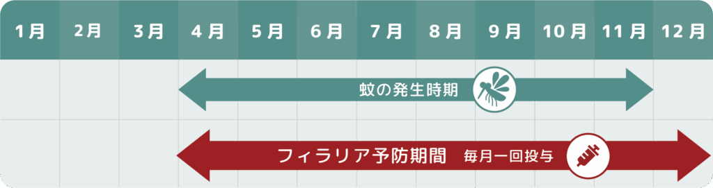 蚊が出始めた頃にスタート → 毎月1回忘れずに投与 → 蚊がいなくなってから1ヶ月後まで続ける